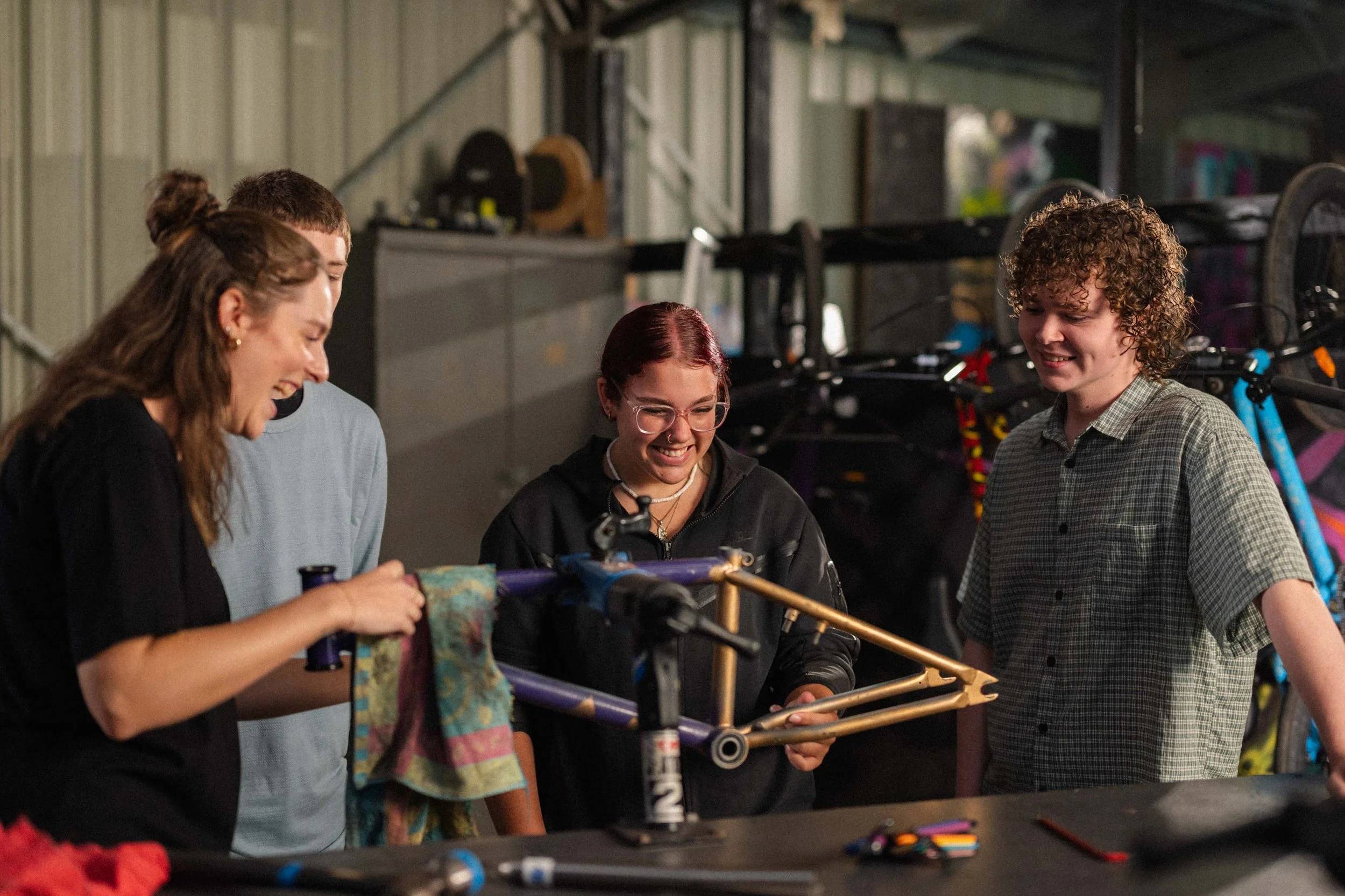 In a workshop environment young people get ‘on the tool’s in our hands, group-based mentoring programs. . Working alongside our team of professional mentors, they complete practical projects, such as building their own bikes to keep.